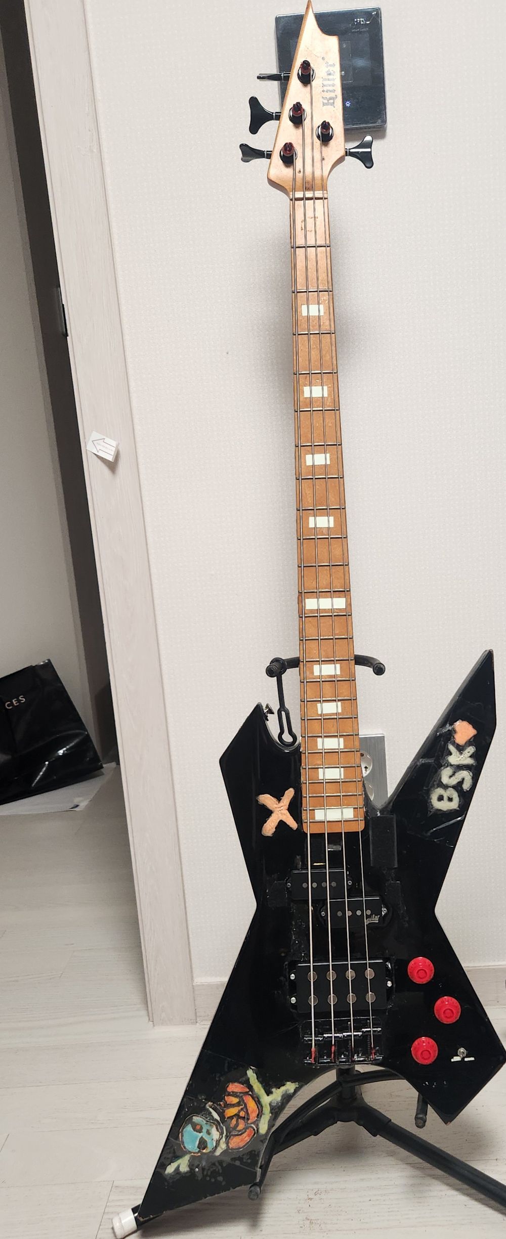 https://youtu.be/XBC0oj-5S3A X의 음악을 들어봤으면(X-Japan시절 말고요,,)누구나 타이지의 베이스에 관심이 갑니다.중고로 떳고 그래서 올거니 하고 대려 옵니다.근데 당시 주인도 이게 대거라고 올렸습니다...아무 손도 안된 순수한 킬러크로스 베이스의모습...모양도 이쁘고 그래 좋다 했는데여기서 수많은 불편한 점이 터지기 시작합니다...잘안보이시겠지만트러스로드고 노브고 전부 일자드라이버 사용입니다.렌치는 브릿지에서만 쓸수있습니다...ㅡㅡ3대1 구조지만그냥 4개의 동일한 방향의 헤드머신을 그대로 썻습니다.네 1번줄 돌리는 방향이 반대입니다....그리고 넥 다이브 발생..네 머 그렇다 쳐도 왼손이 되기만 하면 별 상관 없다라고 쓰려고 하는데...전 손가락이 긴편입니다.그런데 넥의..